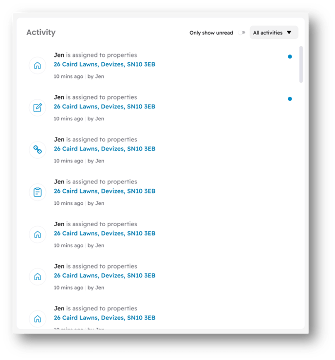The activity log provides a real-time list of events actioned by other users on your assigned properties. It also offers visibility into information updated by ViewMyChain and third parties in the background, ensuring you stay informed about updates you might not otherwise notice.